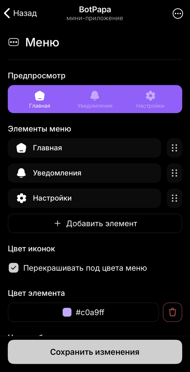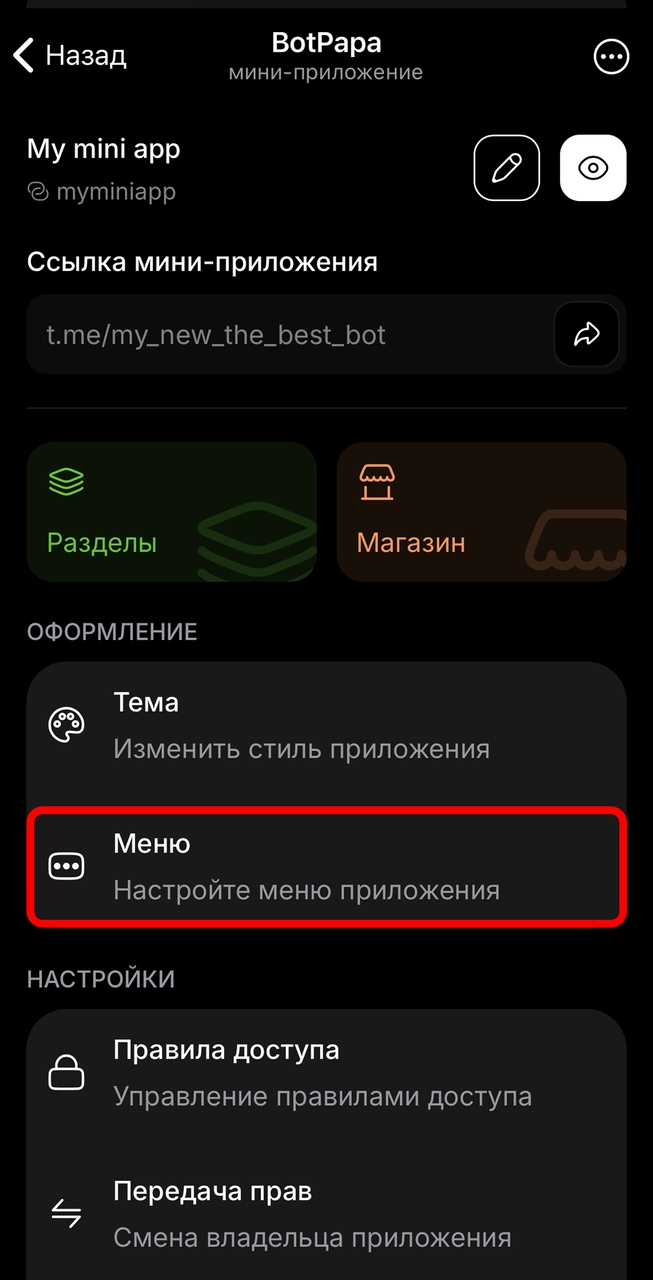 После сохранения изменений меню сразу же появится в вашем мини приложении
